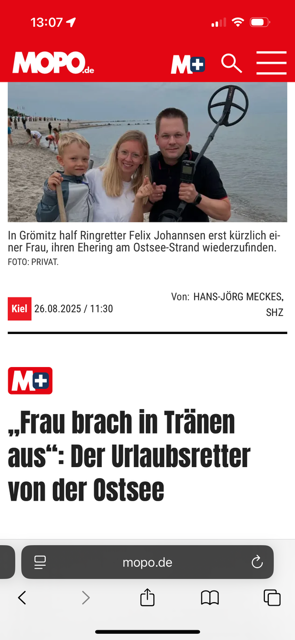 Am Strand der Ostsee und an der Nordsee passiert es im Sommer jeden Tag: Unbekümmert genießen Menschen ihren Urlaub, und am Ende des Tages fällt ihnen auf, dass sie ihren Ring, ihren Autoschlüssel oder einen anderen Gegenstand verloren haben. Das ist oft der Moment, in dem das Telefon von Ringretter Felix Johannsen klingelt. Der Familienvater rettet mit seinem Hobby regelmäßig Touristen ihren Urlaub.